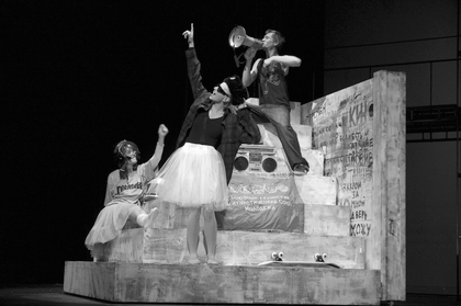 - Действие перенасыщено переменами, которых так требовали, по Цою, наши сердца и глаза, и порой даже невозможно уже представить, что всё это так и было совсем недавно в нашей с вами стране, в нашей с вами истории, и всё это пережито. В спектакле, как в песне, только наоборот — года спрессованы в мгновения, напоминающие кадры-вспышки: Афган, Берлинская стена, путч, ГКЧП, штурм Белого дома, всевластие бандитов… Всё — точно росчерком пера подано в зарисовках, где трагедия чаще предстаёт в виде фарса, где с прошлым пытаются расстаться-поквитаться, если не смеясь, так, по крайней мере, улыбаясь.