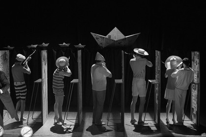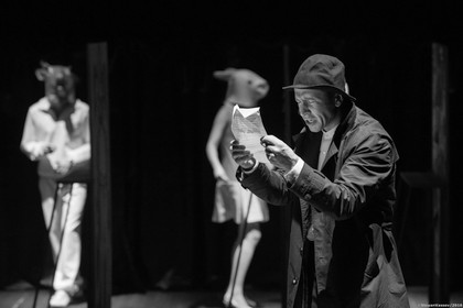 - Волемира играет Томас Моцкус. За годы в труппе «Мастерской» — это вторая главная роль актера (после Мечтателя в «Белых ночах» 2003 года). Играет отменно, бенефисно! Этот угловатый, костлявый пешеход в обтертом советском костюмчике, в коротких по-клоунски штанах, с приплюснутым чаплинским котелком, нахлобученным до глаз, застенчивый, лысоватый полуаутист, влюбленный в жену Лизу… он и ходит, точно боится воздуху сделать больно! Боком, боком, опустив глаза, страдая от соприкосновения с миром. Или от страха, что мир его заметит.