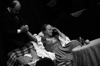 - Тот Островский, которого ставит Фоменко, располагается во времени скорее растянутом, чем неопределённом. Фоменко обладает своей, осязаемой и глубокой связью с внутренним миром персонажей Островского — актёров, купцов, девиц в погоне за мужем, мужчин в погоне за успехом, неудовлетворённых мещан — слишком уязвимых, чтобы предстать героями, и слишком слабых, чтобы не вызывать сочувствия […] …чистое очарование.