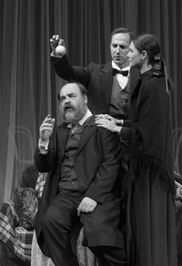 - …и самоигральный Островский нуждается в избирательном сродстве с режиссером, чтобы тайное очарование описываемой им первобытной буржуазии стало явным очарованием театральности. Такие режиссеры — режиссеры с «островской» группой крови — случаются редко, но если случаются, то могут создать нечто столь неожиданное и чудное, что только диву даешься, почему пылится на полке фантастическая и реальная театральная страна: Островский. К таким режиссерам принадлежит на нашем театре П. Фоменко.